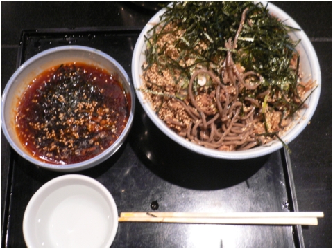 この卵と辛目のつけだれと蕎麦と肉とねぎと海苔の絡み具合が最高!!!